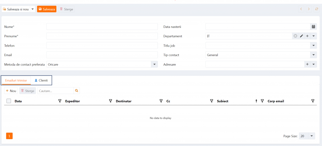 In pagina nou deschisa completeaza datele contactului (nume, prenume, adresa, e-mail etc.) Tot de aici vei putea trimite e-mail persoanei de contact si vei putea aloca o companie pentru contactul creat.